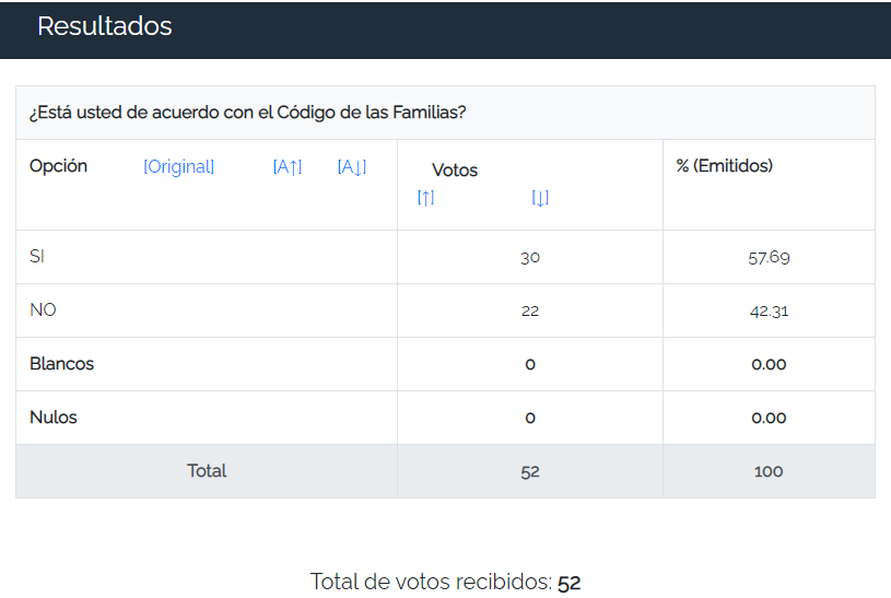 De acuerdo al Consejo Electoral Nacional (CEN) y sin ninguna forma de contrastar los datos, en el referendo del Código de las Familias la aprobación alcanzó el 66% de los votos válidos (5.892.705), mientras que el rechazo fue del 33%, y la abstención del 26% del padrón.