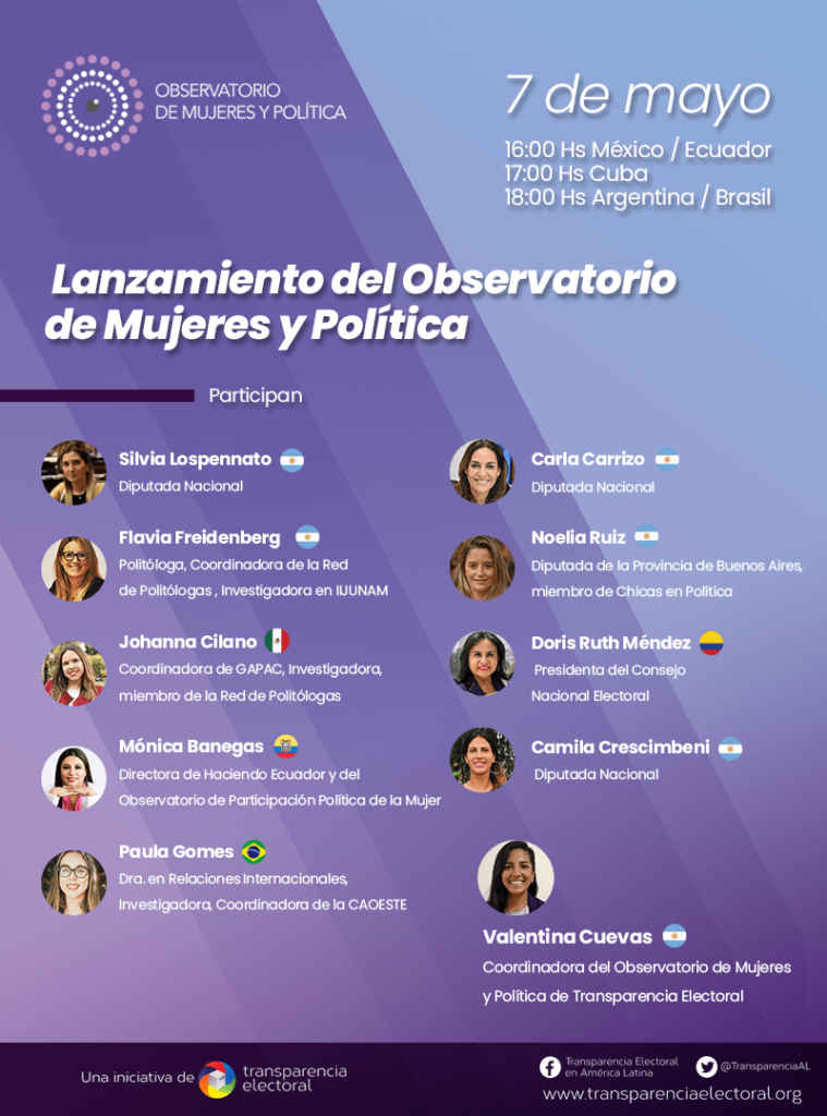 El lanzamiento del Observatorio de Mujeres y Política se realizará el día viernes 7 de mayo de 2021, a las 18 hs (Argentina). El evento será transmitido a través de la plataforma Zoom y con transmisión en vivo en Facebook. Las inscripciones se encuentran disponibles en este link.