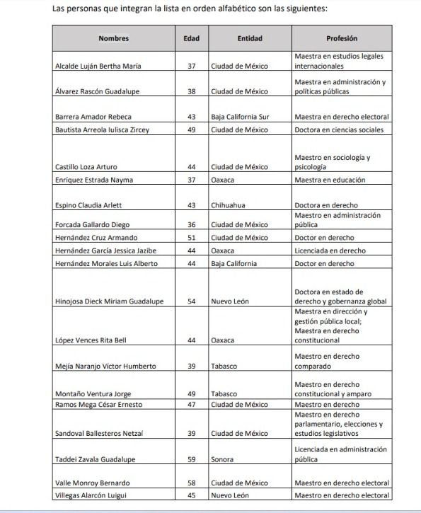 El comité técnico encargado de evaluar a los posibles consejeros, selecciono el 24 de marzo a los 20 finalistas para integrar las quintetas (lista de cinco posibles consejeros), de las tres primeras salieron los tres seleccionados para ocupar el cargo de consejero hasta 2032 y de la cuarta quinteta salió la nueva presidenta.