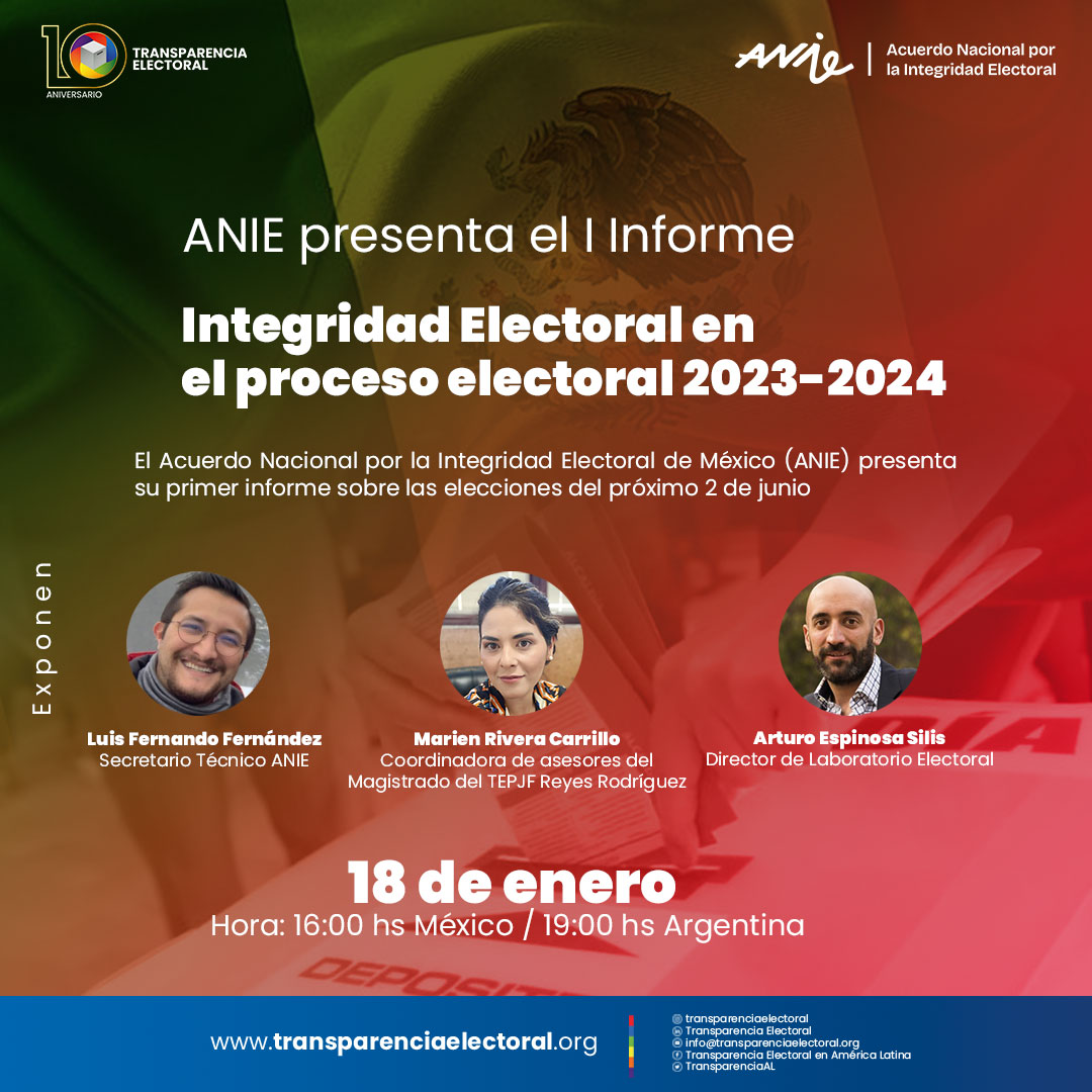 De cara a las Elecciones Generales que se celebraran en México el próximo 2 de junio, Transparencia Electoral te invita a la presentación del primer informe del Acuerdo Nacional por la Integridad Electoral de México (ANIE) sobre los comicios de este año.