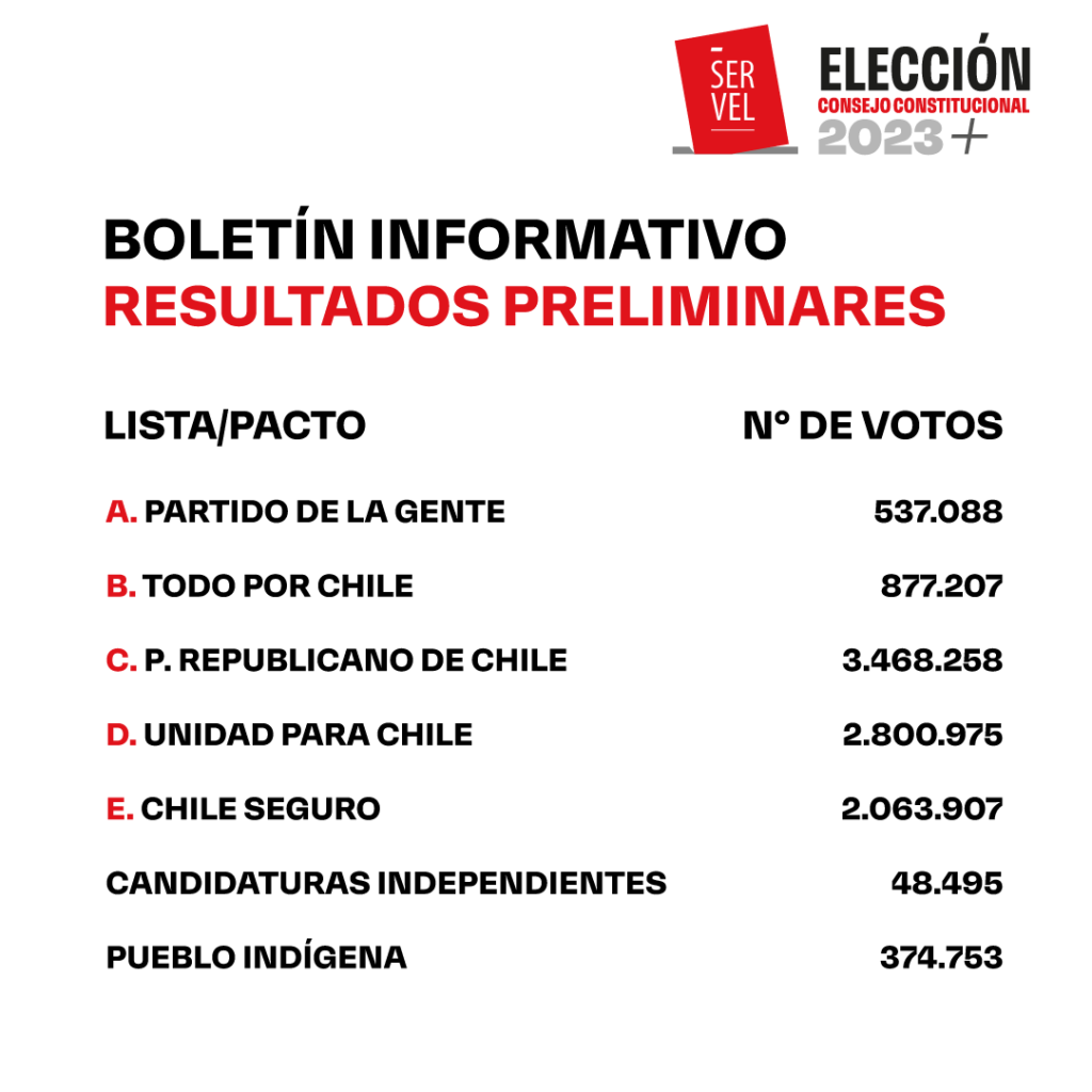 Los resultados electorales reflejaron un claro triunfo del Partido Republicano, la fuerza política liderada por el excandidato presidencial José Antonio Kast. Según el Servicio Electoral (Servel), con el 99,98% de las mesas escrutadas los partidos obtuvieron: