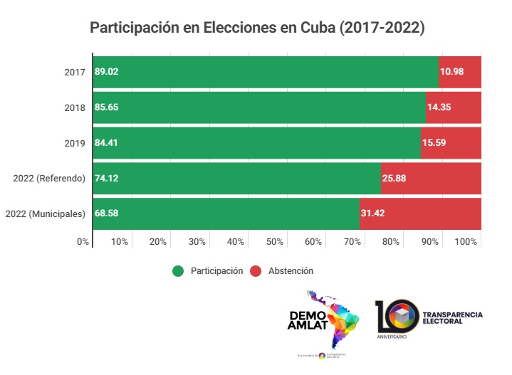 La abstención en las elecciones cubanas viene incrementándose desde el 2013. Antes de ese año, los porcentajes de participación superaban el 90% y hasta el 95%. Pero desde aquel entonces en adelante, la participación empezó a mermar paulatinamente. En las municipales de 2013 la participación fue de 90%, en las de 2015 fue de 88,30%, en las elecciones para la Asamblea Nacional del Poder Popular de 2018, la participación fue de 85%, mientras que en el referendo para la aprobación de la nueva Constitución en 2019 la participación fue del 84%.