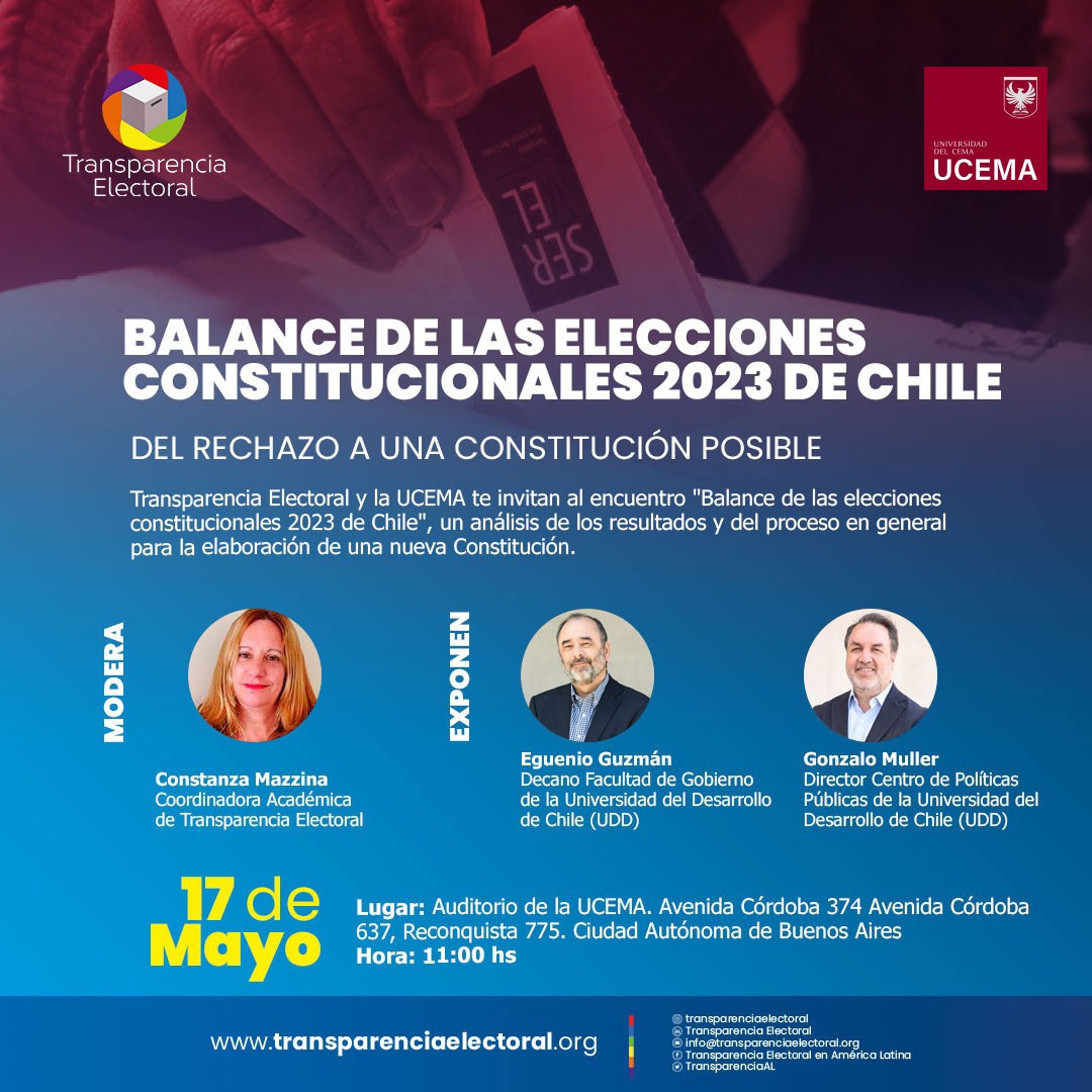 El próximo 17 de mayo Transparencia Electoral y la Universidad del CEMA (UCEMA) te invitan a participar del panel “Balance de las elecciones constitucionales 2023 en Chile. Del rechazo a una constitución posible”