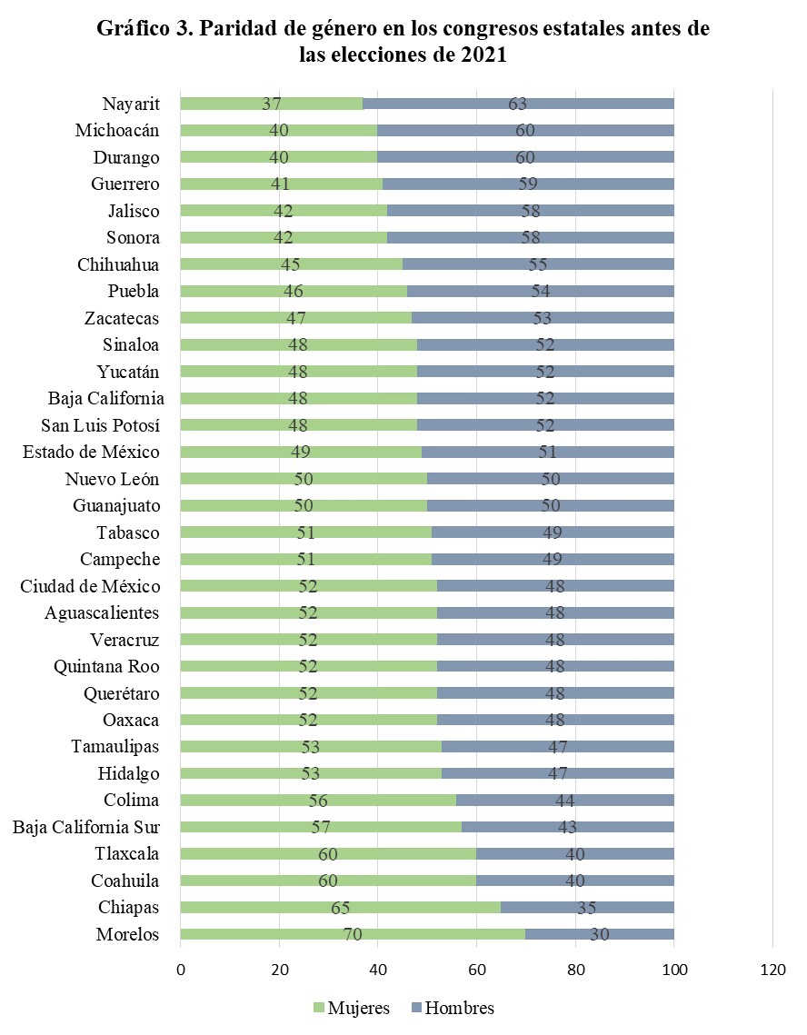En consecuencia, en 18 estados del país las mujeres ocupaban más del 50% de los asientos en el congreso y sólo en tres estados (Durango, Michoacán y Nayarit) las mujeres ocupaban el 40% o menos (IMCO, 2021).